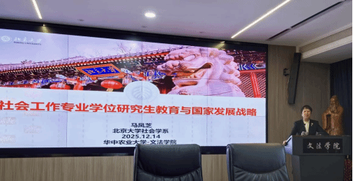 2025年12月14日,北京大学社会学系马凤芝教授应邀主讲,以“社会工作专业学位研究生教育与国家发展战略”为题,围绕国家重大政策与行业实践,系统阐释新时代社会工作人才培养的目标定位、实践路径与战略价值,为在场师生带来了一场融合理论洞察与实践指引的学术盛宴。会议由社会工作系万江红教授主持,社会工作系师生参加会议。