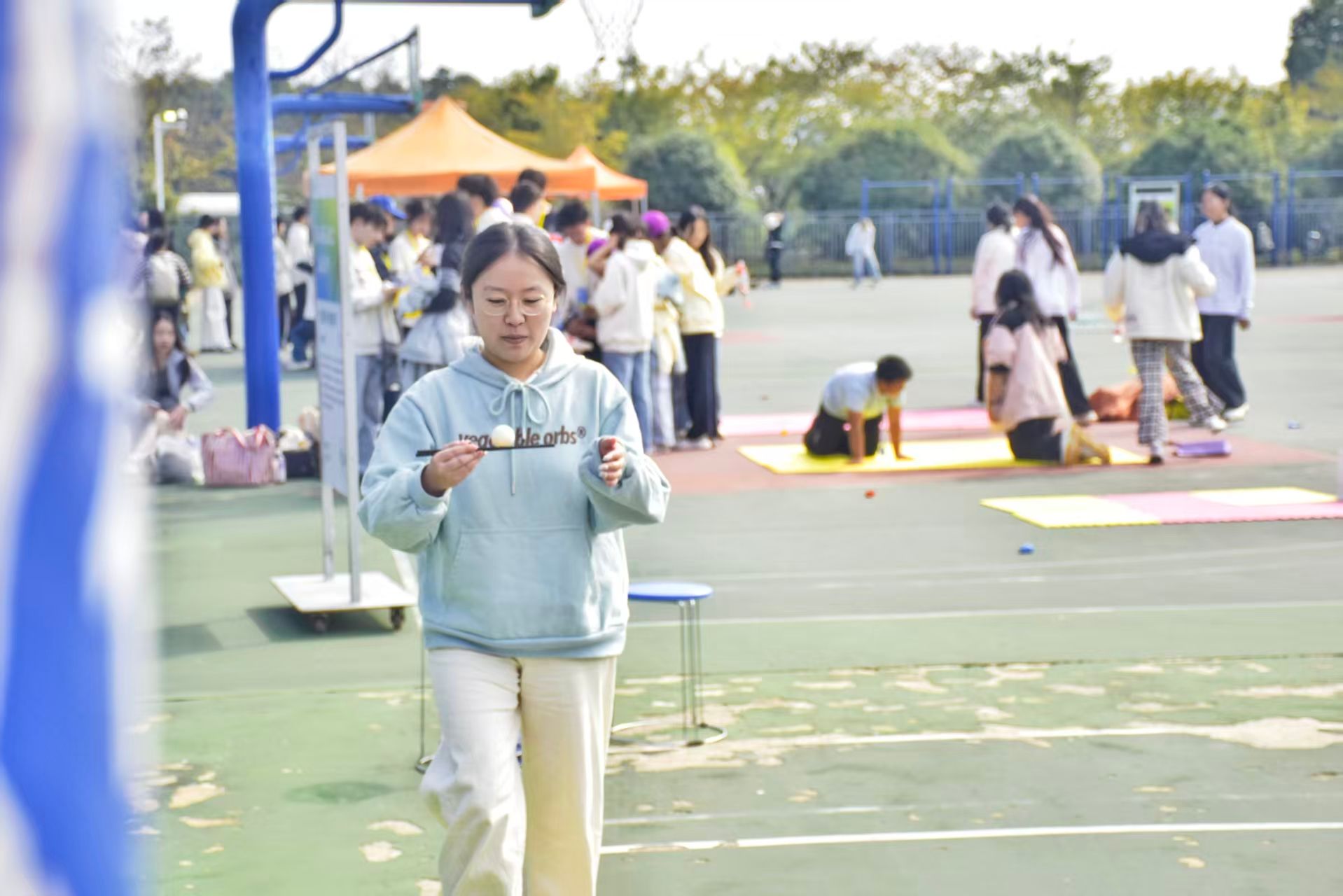 赛场上,师生同台,风采尽显。有的队伍配合默契,一气呵成,引来阵阵喝彩;有的选手在“筷子夹球”环节偶有失误,却毫不气馁,沉着调整后继续冲刺,展现了拼搏进取的体育精神。现场加油声、欢笑声、呐喊声此起彼伏,将比赛不断推向高潮。