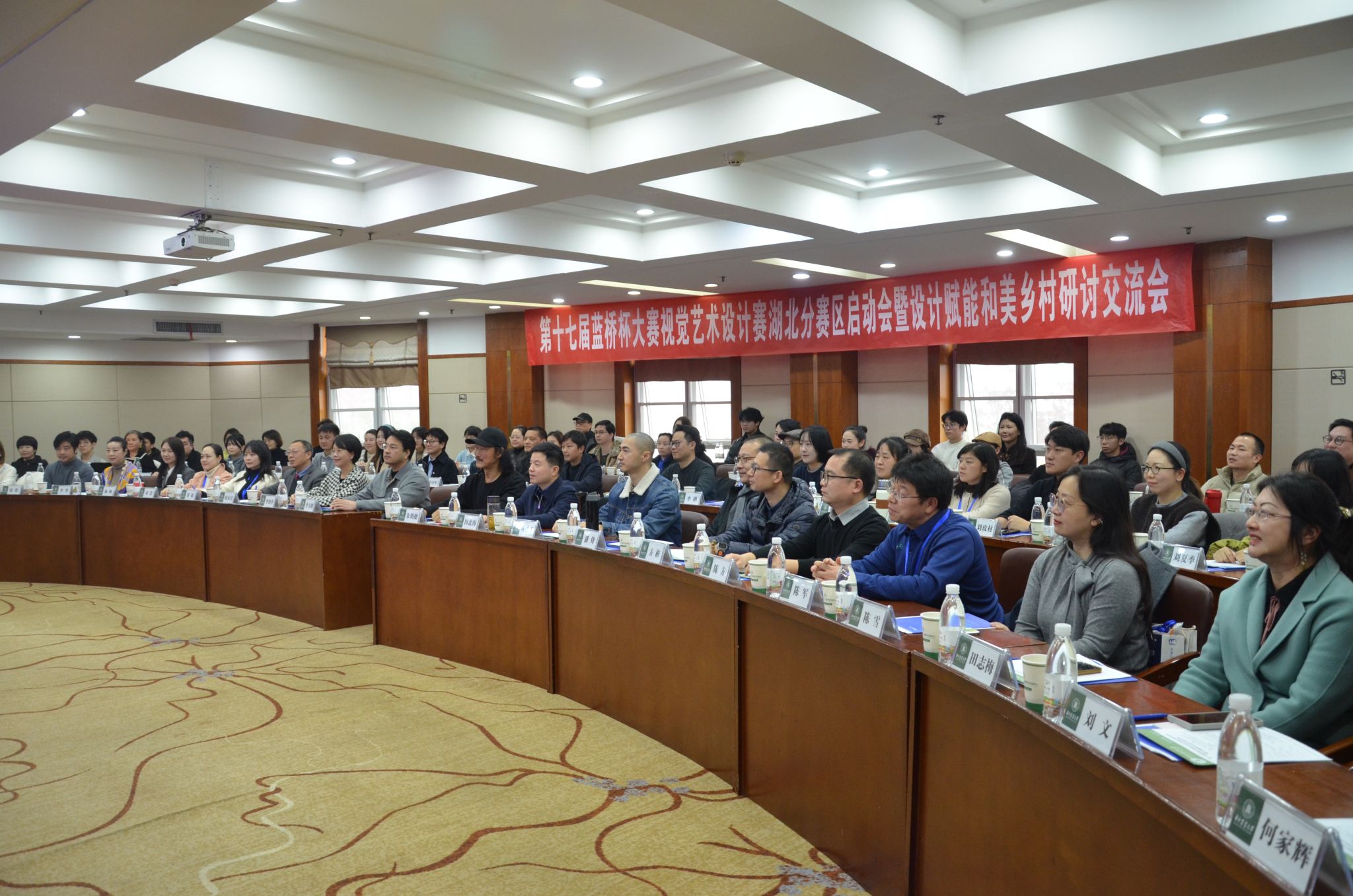 (通讯员 王宗睿、徐讯)2025年12月20日下午,第十七届蓝桥杯大赛视觉艺术设计赛湖北分赛区启动会暨设计赋能和美乡村研讨交流会在我校国际学术交流中心的五楼会议室举办。校党委常委、副校长李大鹏、教育部动画与数字媒体艺术教职委副主任、武汉理工大学动画与公共艺术研究院院长朱明健教授、文法学院党委书记刘广乐、文法学院院长田北海、蓝桥杯大赛组委会秘书长李艳萍、湖北省相关院校教师代表、大赛指导老师与会。开幕式由文法学院党委书记刘广乐主持。