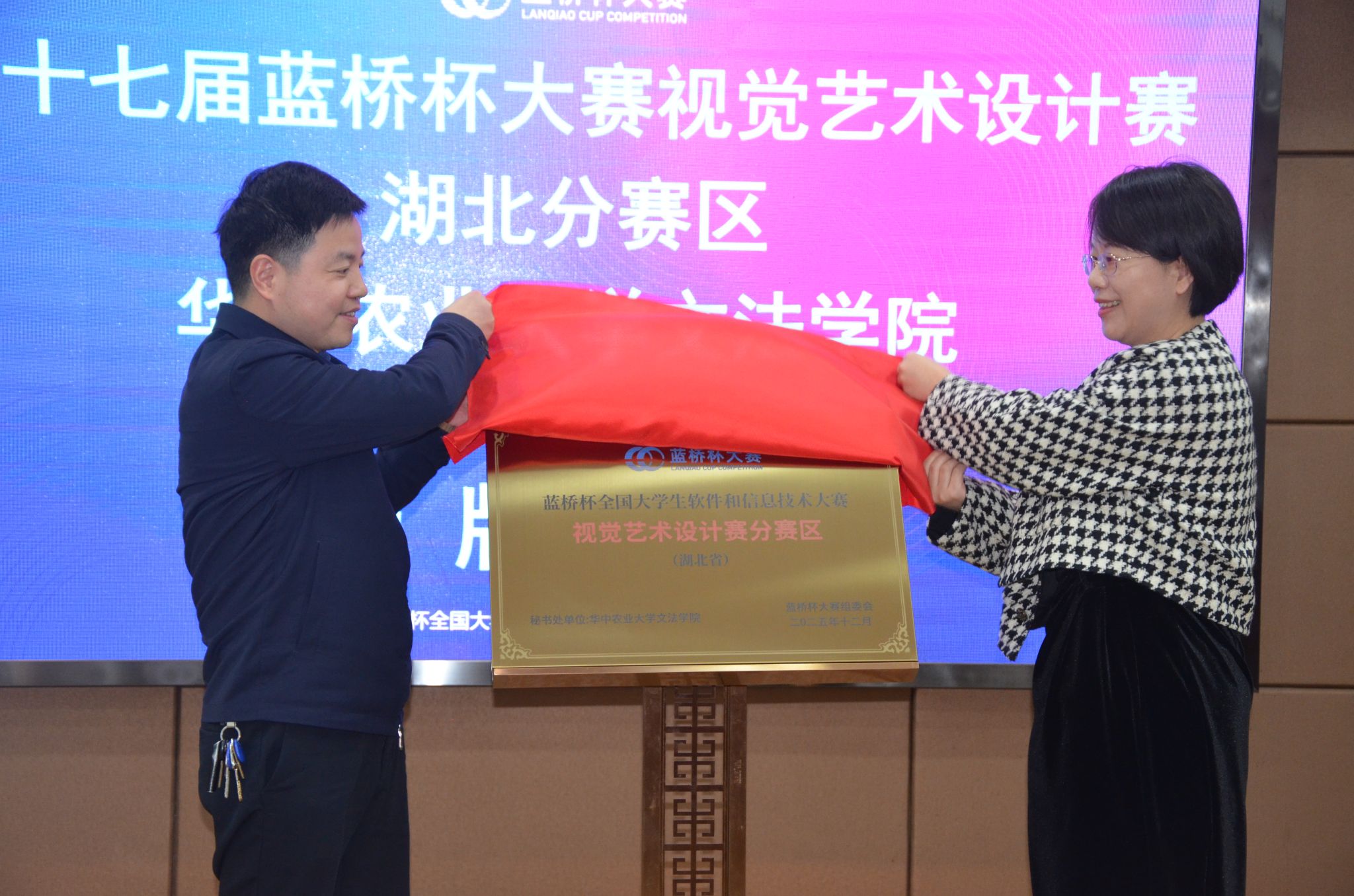 李大鹏致辞对各位嘉宾的到来表示欢迎和感谢。他讲到,“农业是生命与思想之源,也是艺术升华之源”,学校不仅研究粮食生产,更注重农业文化、人文精神与新时代AI等现代技术融合,构建“111”创新创业竞赛体系;倡导将学习与农业文化发展、促进文化繁荣与强国建设。蓝桥杯视觉艺术设计大赛是教育部学科竞赛目录中的A类赛事,期待在这次比赛中看到让人赏心悦目的设计。同时介绍校园艺术环境与多学科创作成果,提出以赛促教、跨学科育人,推动成果转化为实效,实现精神滋养与服务发展并重。聘任仪式由文法学院党委书记刘广乐主持,文法学院院长田北海与蓝桥杯大赛组委会秘书长李艳萍共同完成授牌仪式,并为省内多所高校负责人颁发聘书。