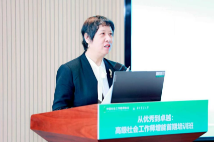 马凤芝在致辞中向精心承办本次培训的华中农业大学致以最诚挚的感谢,她回顾了中国社会工作发展历程,强调高级社会工作师作为“领军人才”的核心纽带作用。她勉励学员坚守专业初心,深化本土化实践;担起职责使命,发挥 “传帮带”作用;秉持终身学习,探索“智慧社工”服务模式。