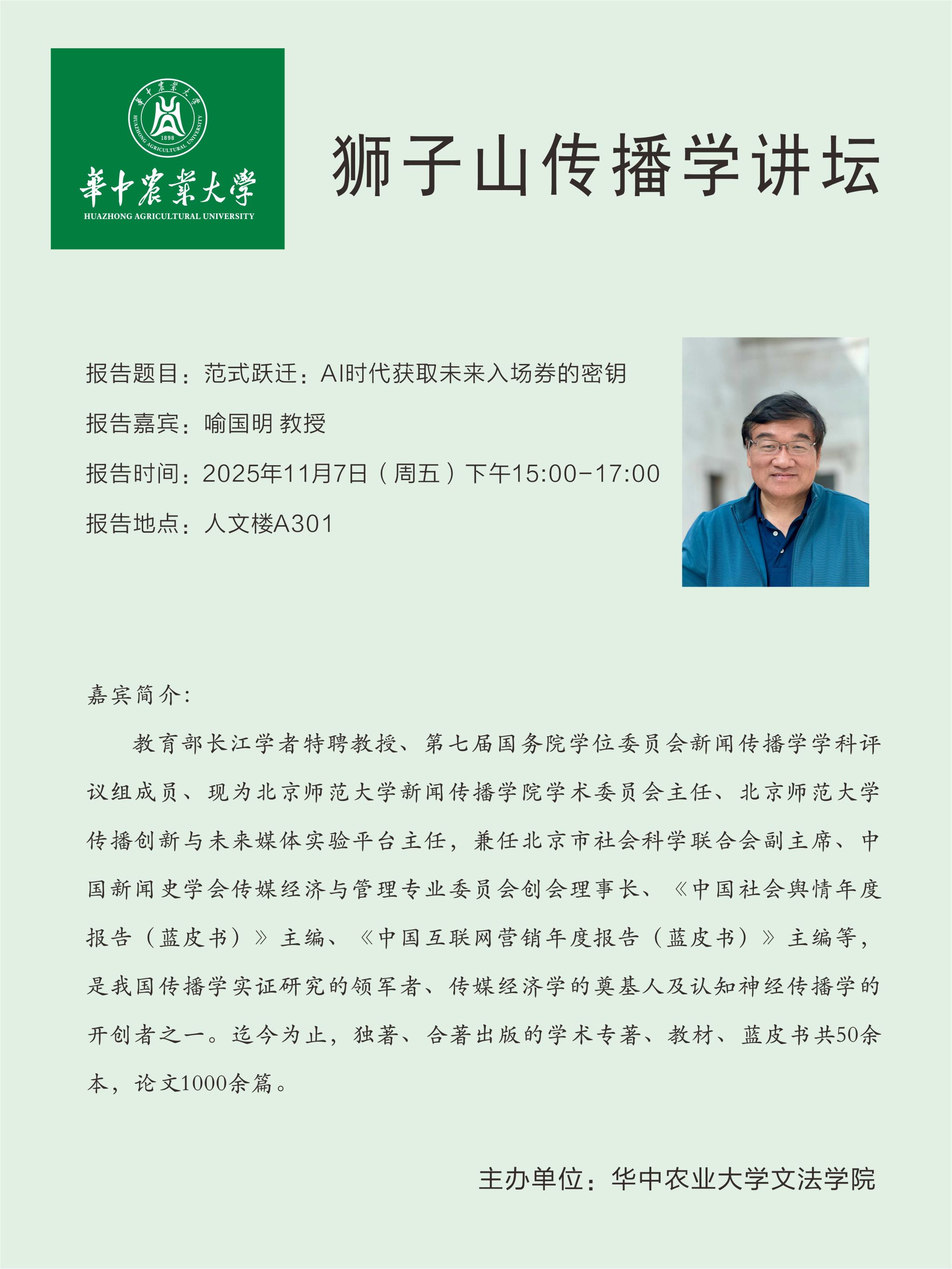 地址:湖北省武汉市洪山区狮子山街一号华中农业大学人文社科楼