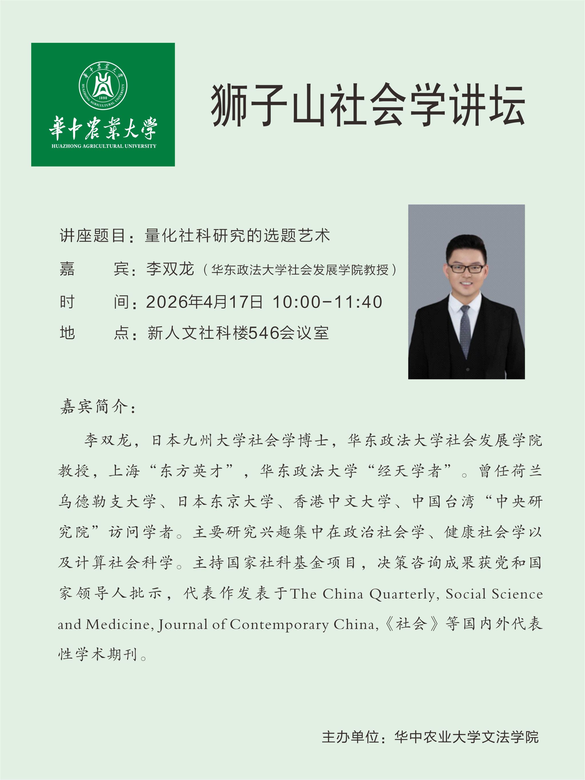 地址:湖北省武汉市洪山区狮子山街一号华中农业大学人文社科楼